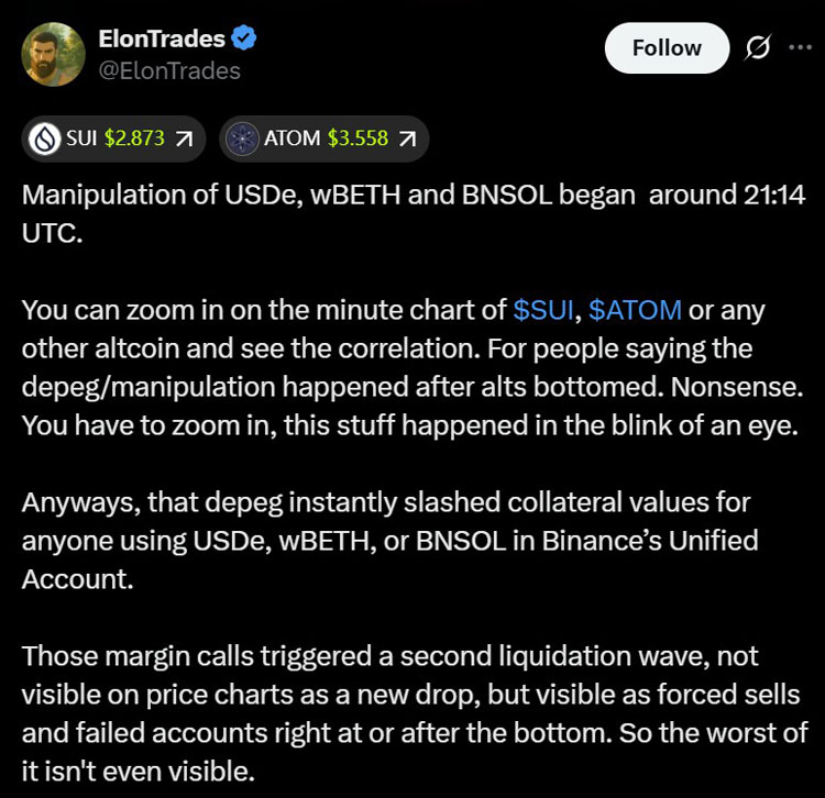 以美元计算,周五的闪崩标志着加密货币历史上最大的清算事件——甚至超过了FTX崩盘——大约190亿美元的杠杆头寸被清除。与山寨币相比,比特币表现相对有韧性,山寨币从峰值到谷底的跌幅更大。