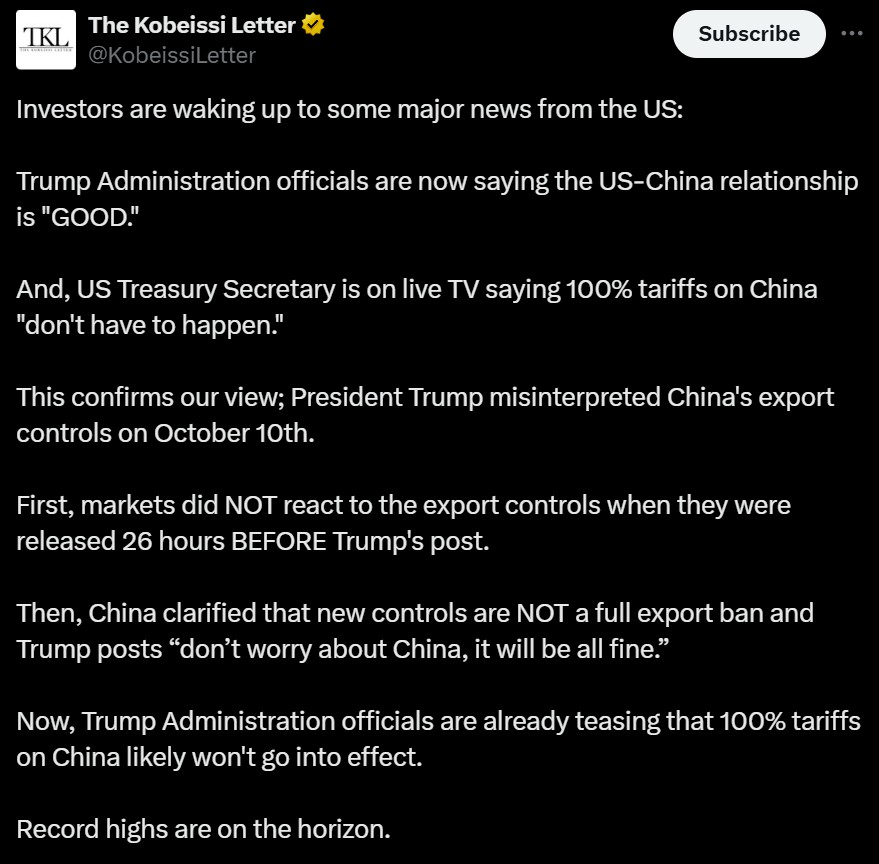 "这证实了我们的观点,即特朗普总统误解了10月10日宣布的出口管制,"市场评论员The Kobeissi Letter写道,指的是中国扩大对国防和半导体行业稀土矿物的出口限制。