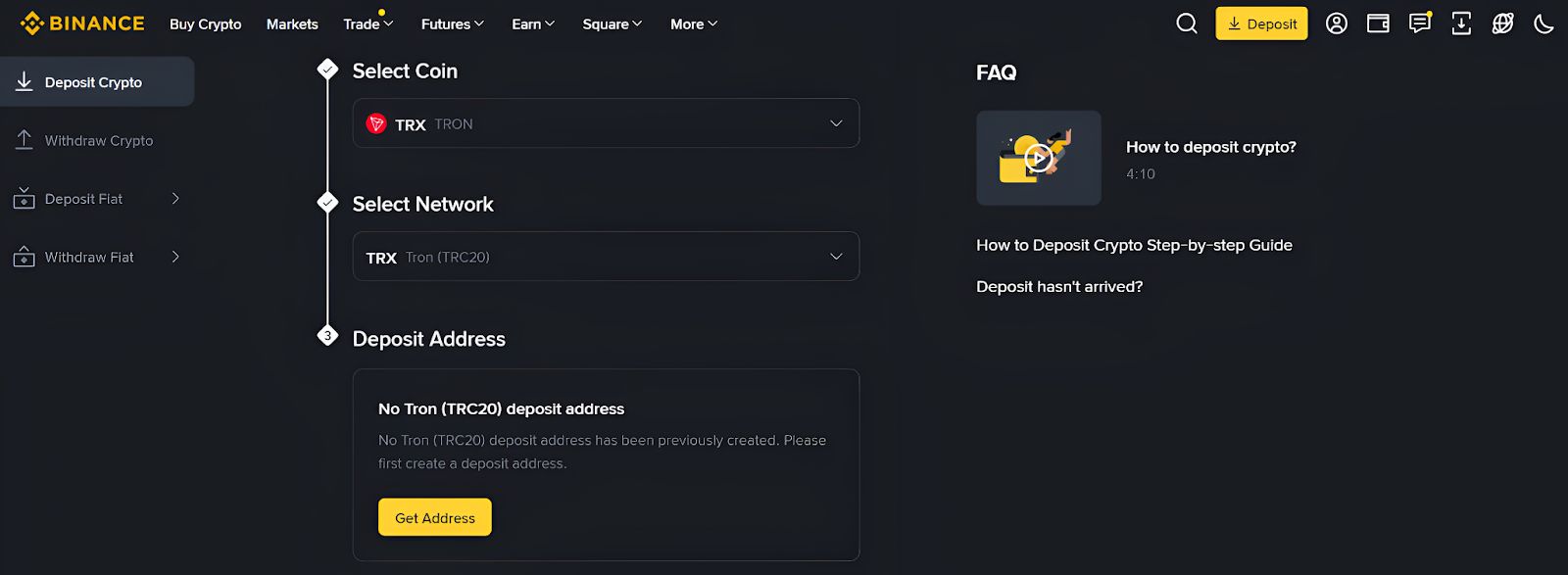 假设您想在币安加密钱包中创建一个 Tron 地址来接收 TRX 代币。要继续操作,请按照以下步骤操作: