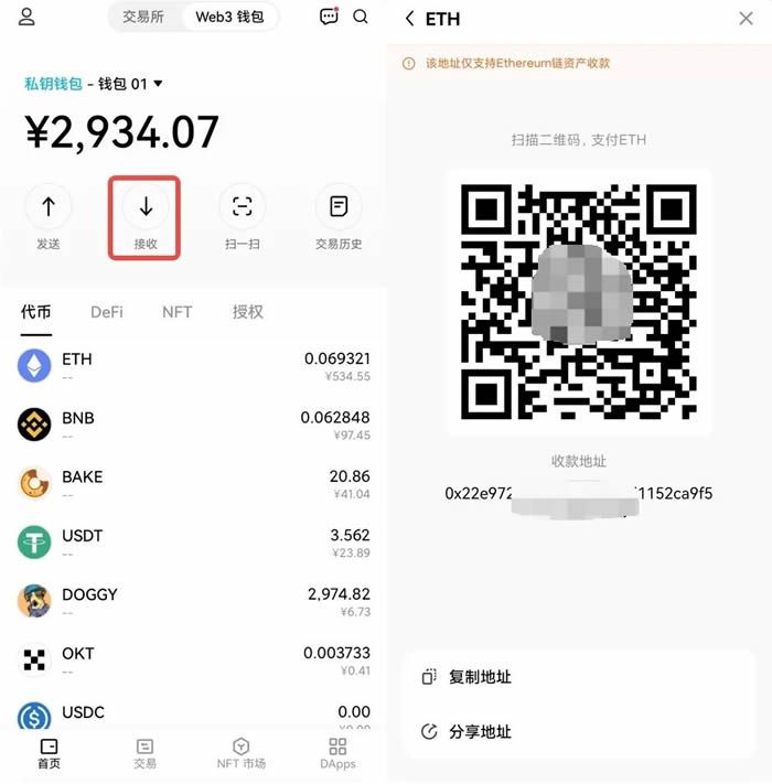 点击【接收】,选择转入币种,会弹出收款地址,复制地址粘贴到其他平台或者钱包的提币界面,便可以将数字资产成功充入Web3钱包。