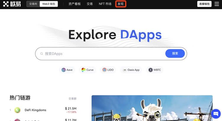 进入欧易官网,在页面左上角选择【Web3钱包】,点击【发现】,下拉界面即可看到可参与的项目列表。您可以选择【DeFi】,并选择【OKC】公链,发现优质项目。您也可以在顶部搜索框直接输入项目名称或网址,参与项目。