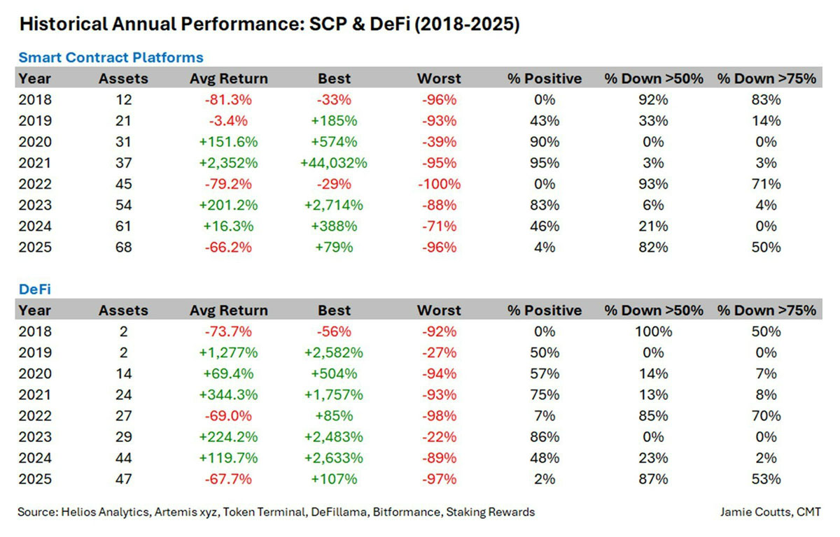 智能合约平台和定义代币,历史年度业绩。来源:Jamie Coutts