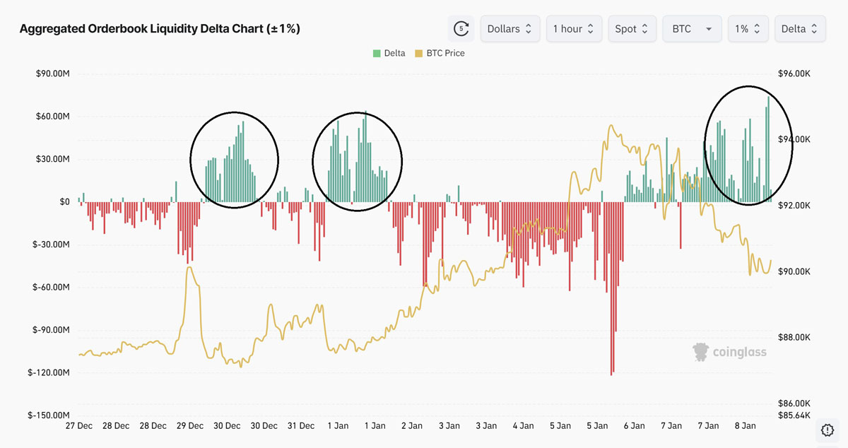 - 9万美元附近的强劲被动买盘可能成为助推器,也可能失效,从而打开8.6万至8.7万美元区间的局面。