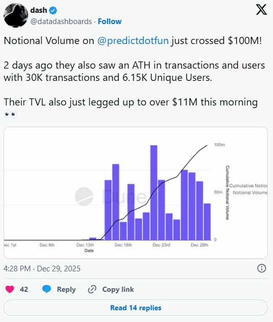 Predict.fun 拥有强大的“聪明资金”支持,专注于提供机构级流动性和对散户友好的用户界面。据 Dune 分析师 @datadashboards 称,截至 2025 年底,其总锁定价值 (TVL) 超过 1100 万美元,Notion 交易量达 1 亿美元。