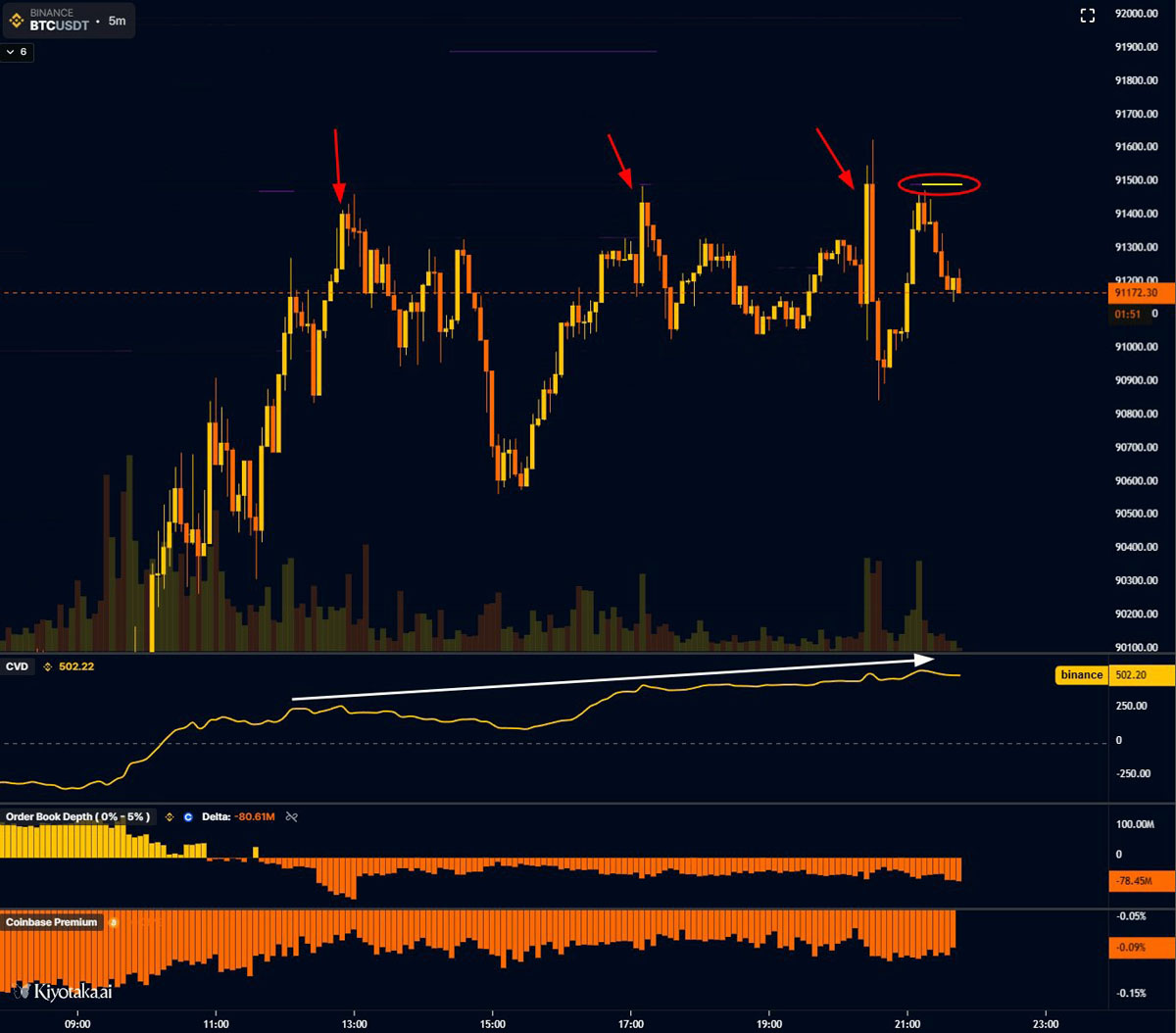 在分析当日交易所订单簿行为时,交易商Skew指出,一名被动卖家活跃于91,500美元价位,持续压低价格。
