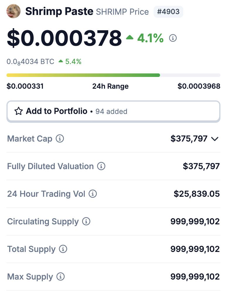 截稿前根据 CoinGecko 数据显示 SHRIMP 市值约为 $375,797,市值较小需留意交易风险。