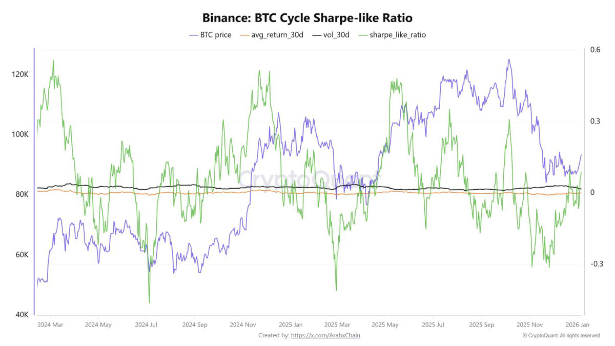 短期指标显示,可能仍需保持耐心。来自CryptoQuant的数据表明,币安上比特币的30天平均收益率为0.0016,与此前阶段相比,动能明显减弱。与此同时,波动率仍维持在接近0.018的高位,凸显市场对短期价格波动的持续敏感。