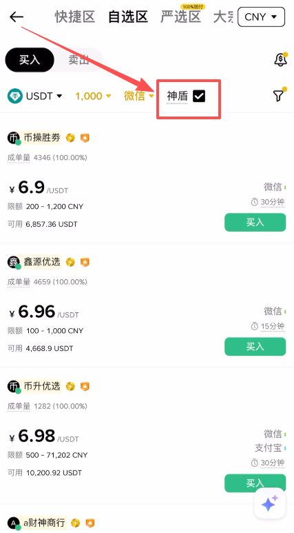 页面上方有四个区域(快捷、自选、严选、大宗),推荐新手直接进入“自选区”**。相比快捷区,自选区能让我们主动筛选优质商家,掌握交易主动权。