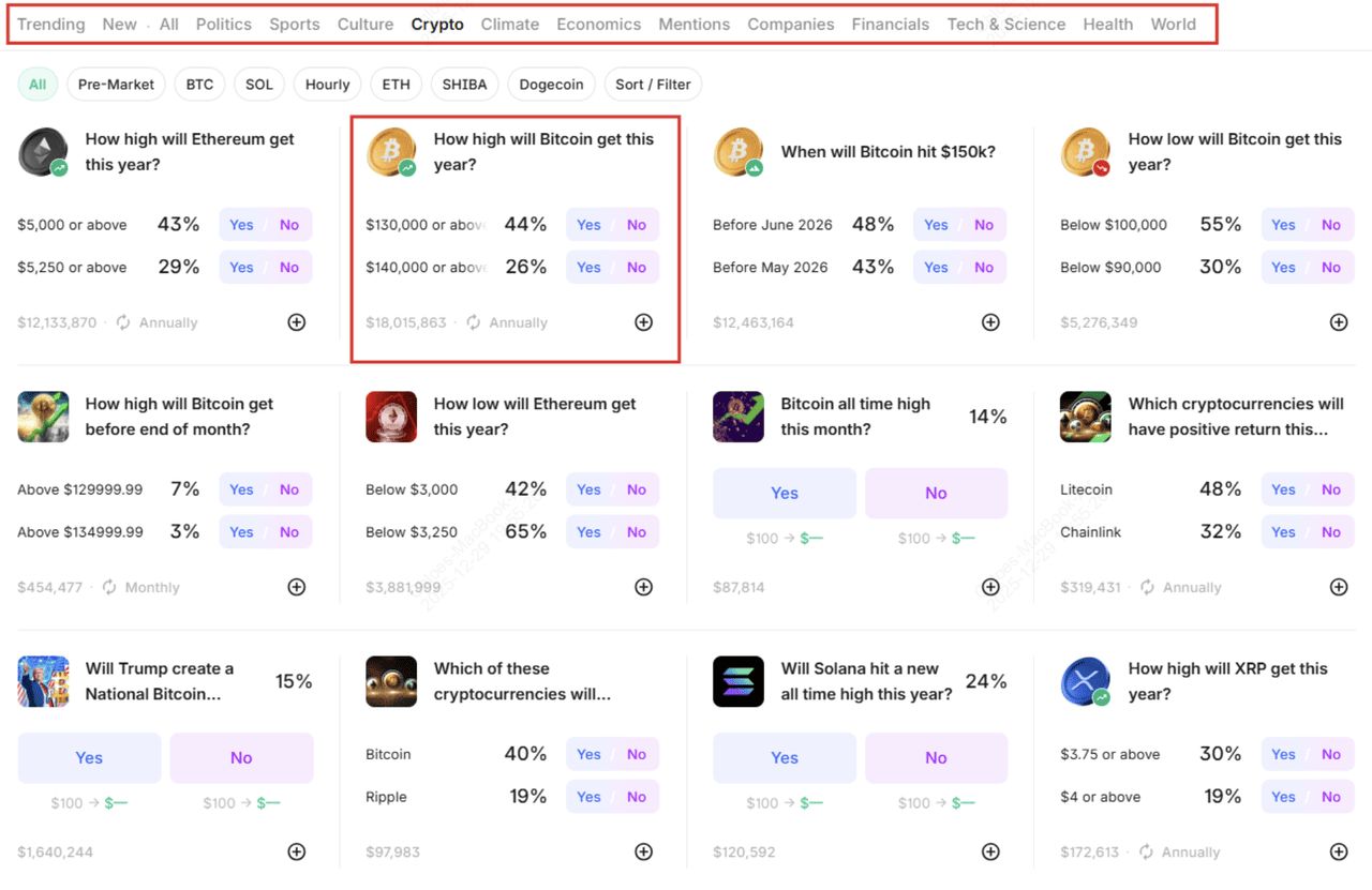 Kalshi 以其直观的是/否合约结构、广泛的类别(包括金融(联准会利率、衰退几率)、政治、体育(比赛获胜者、锦标赛)、娱乐(奥斯卡、葛莱美)、加密货币和现实世界资产 (RWA)),以及用于组合投注的创新组合而脱颖而出。