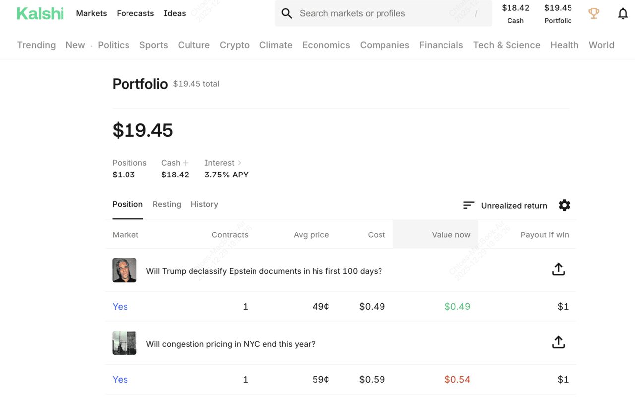 在您的投资组合仪表板中追踪未平仓交易,提前卖出以锁定利润/止损,或持有至结算以获得赢家全额 1 美元派彩。
