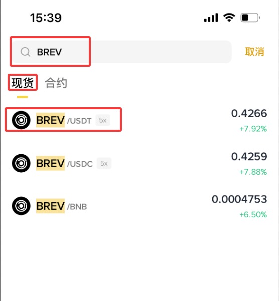 3、输入【BREV】,这时下拉会显示【现货】【BREV/ USDT】,点击【BREV/ USDT】。(作为新手,不建议做合约,所以这里就不演示合约购买方式了。)