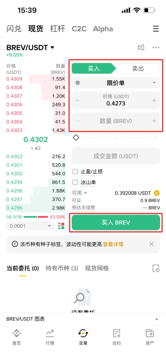 5、依次选择【限价单】-购买【价格】-购买【数量】-【成交数量】,设置好之后,点击【买入BREV】。
