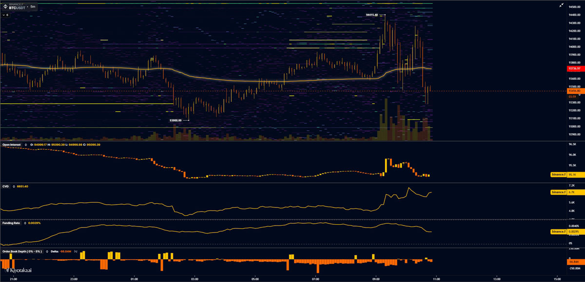 “多头在9.4万美元第二次附近觉察到这个细微信号后离场,仅留下尾盘空头开始建仓。通常这类日子衰减很大,” 他写道,同时附上了交易所订单簿数据图表。
