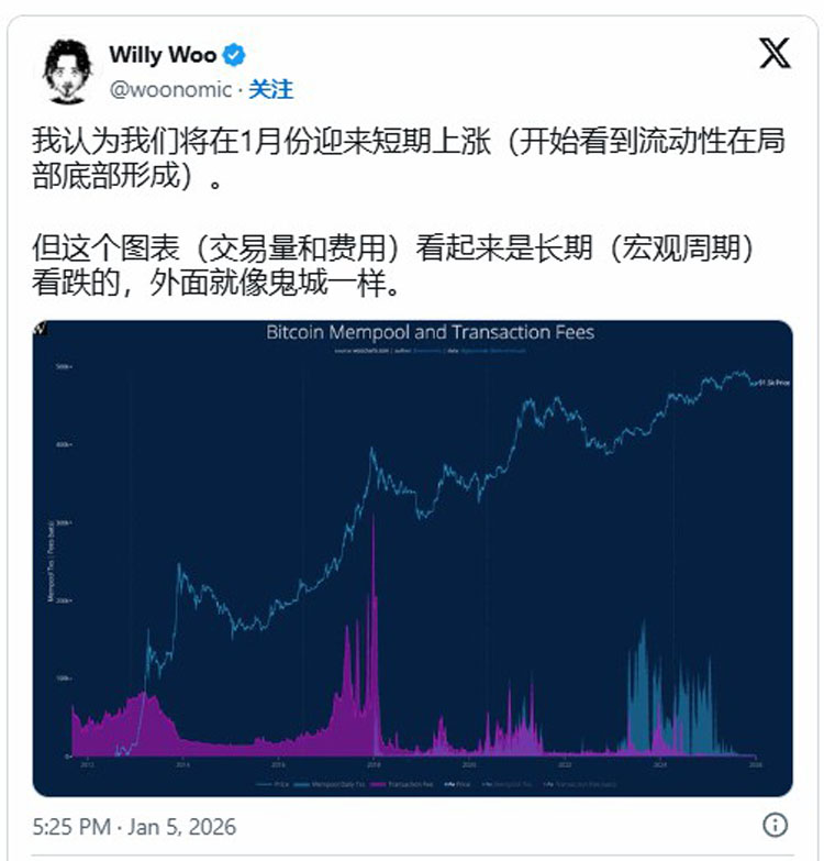 “我认为我们将在1月份迎来一波短期上涨(开始看到流动性触底回升)。”他在向X平台粉丝们发送消息时说道,并附上了一张内存池大小与交易费用的图表。