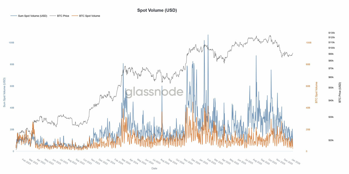 与此同时,链上分析平台Glassnode报告称,加密货币现货交易量已降至2023年末以来的最低水平。