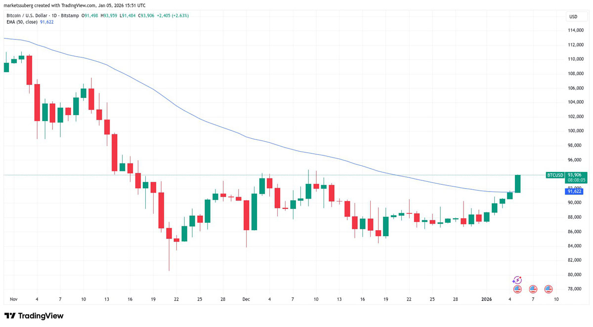 比特币本身已升至自12月11日以来的最高水平,突破了50日指数移动平均线(EMA)和91,600美元,并逼近2025年全年开盘价93,500美元。