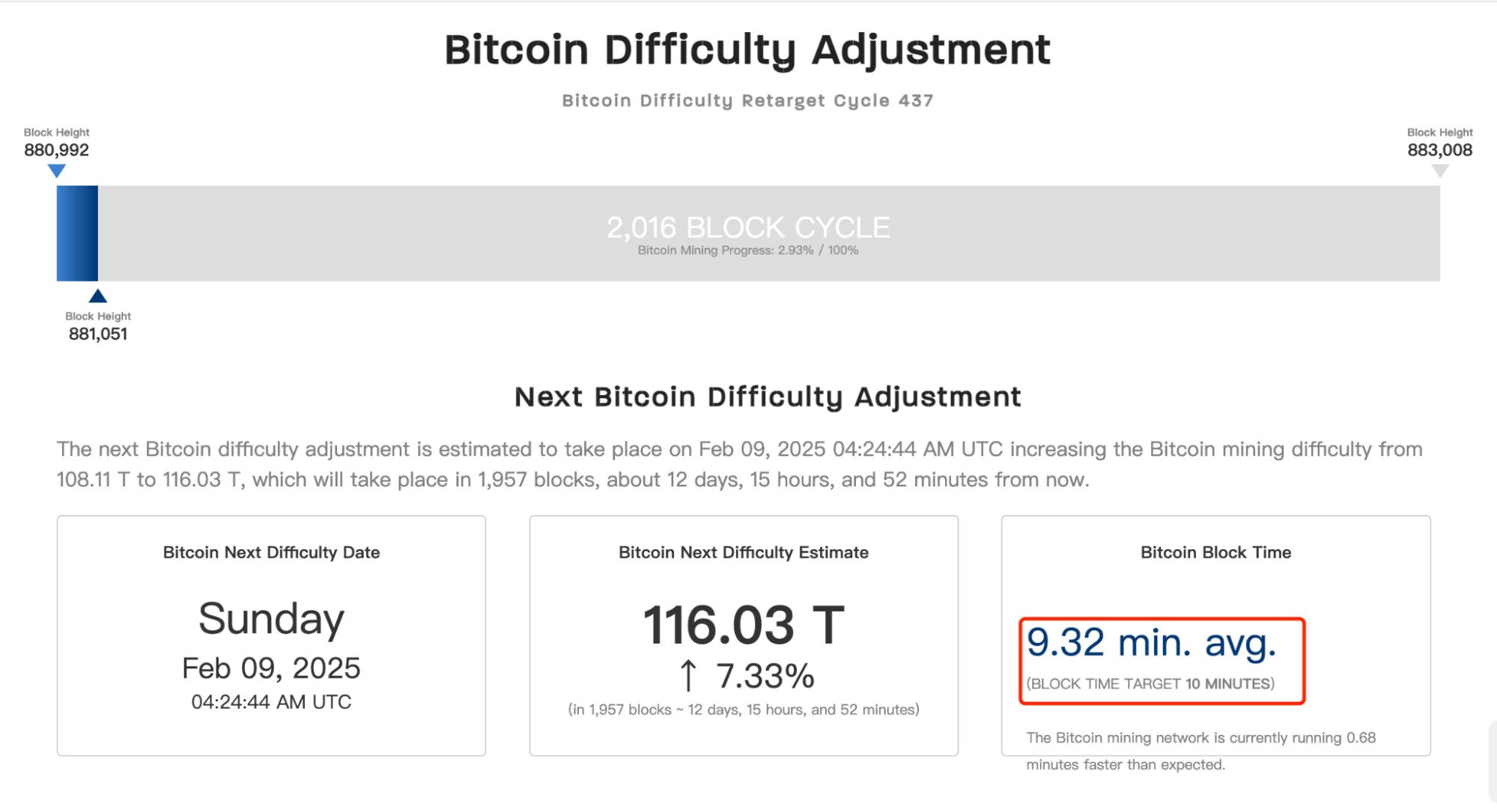 矿工增加算力:当矿工数量增加或每个矿工升级更强的矿机时,整个网络的算力会增加。更多的矿工意味着更多的计算尝试和更高的计算能力,矿工能够更快地找到符合条件的哈希值。为了保持平均每10 分钟一个区块的出块速度,比特币系统会自动提高挖矿难度。
