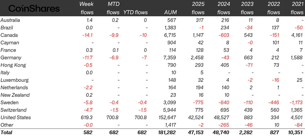 过去五年各国流量(以百万美元计)。来源:CoinShares