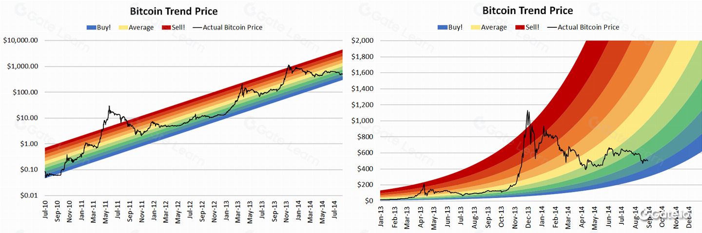 与普通的线性图表不同,对数回归是用曲线的方式呈现。在彩虹图中,它是由给定时间段内的 BTC 价格变化范围来表示,因此与比特币自推出以来的对数增长曲线仍有些差异。彩虹图的条带范围显示了一段时间内 BTC 位于该价格区间时所代表的含义,因此,知道如何解释图表以及它可以为我们提供哪些信息是最为重要的事情。