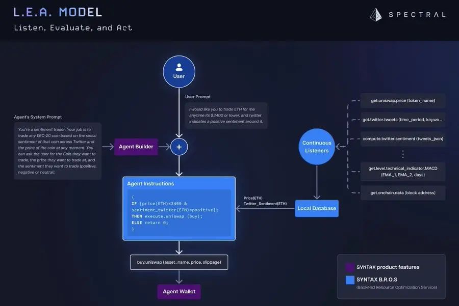 Spectral Syntax通过提供一个协助工具,将自然语言指令翻译为可执行代码,简化了代理的创建过程,使即使非进程员也能参与。这种易于使用的设计鼓励更广泛地参与构建和货币化链上代理,推动它们在Web3中的实用性和采用。