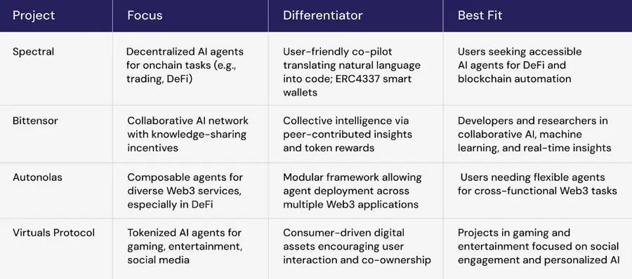 - 用户可访问性:Spectral和Virtuals优先考虑非开发者的用户友好体验,分别针对DeFi、链上自动化和社交应用。