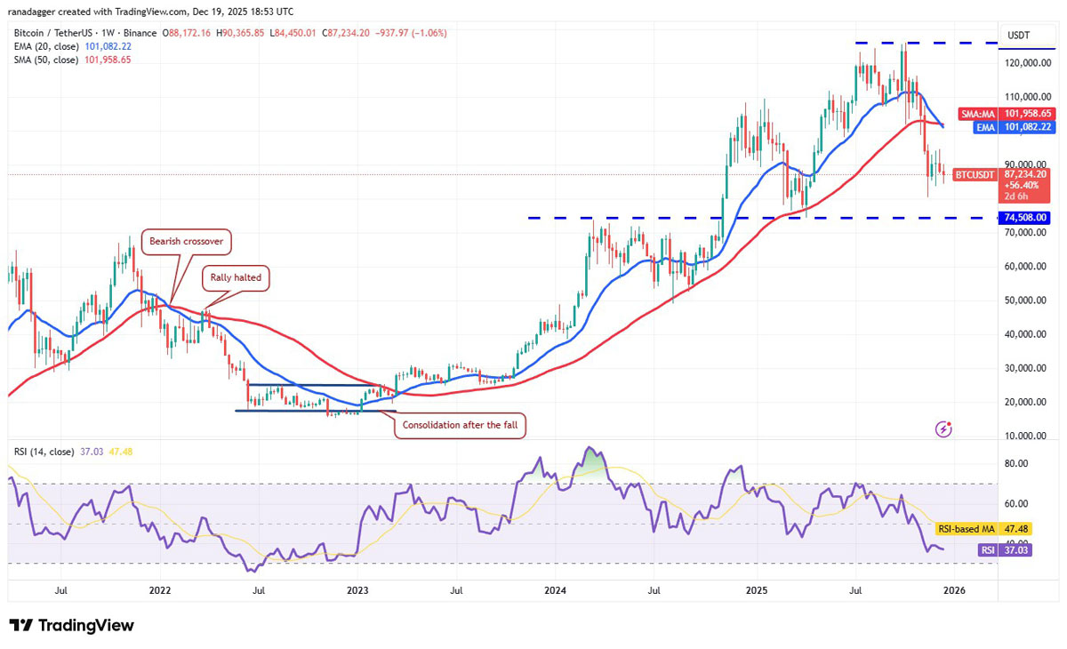 如果历史重演,价格从移动平均线回落,该货币对可能再次跌至74,508美元水平。支撑位被反复测试往往会使其强度减弱。一旦跌破并收盘于74,508美元下方,就可能形成看跌的头肩顶形态,从而为跌向50,000美元打开大门。此举可能推迟上行趋势的恢复,因为市场在经历大幅下跌后往往会进入盘整阶段,这一点从2022年6月至2023年2月的情况便可看出。