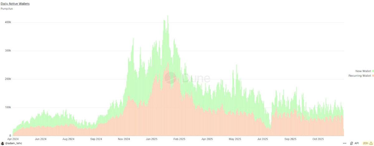 代币启动平台Pump上的钱包活动。fun展示了表情包在索拉纳的兴起。来源:Dune Analytics