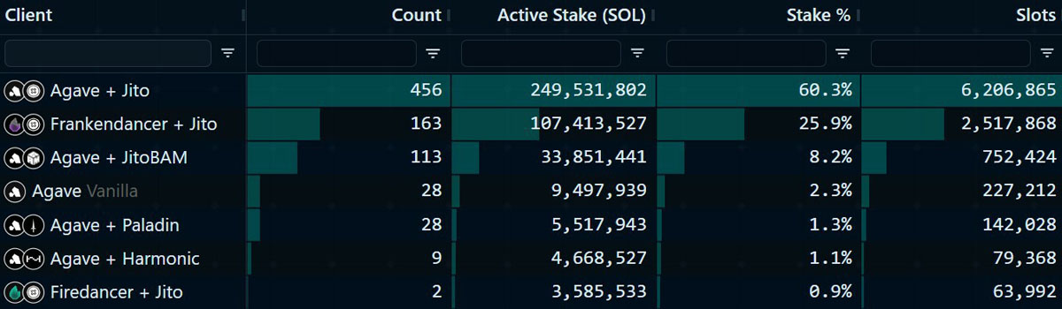 目前,有两家验证者正在运行完整的Firedancer客户端,但一种名为“Frankendancer”的混合版本已得到更广泛的采用。数据显示,约有165家验证者——约占总质押量的26%——如今正同时运行Frankendancer与现有的Agave客户端。