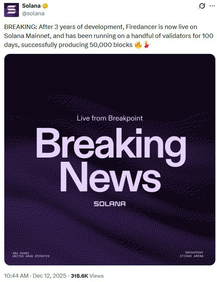 索拉纳基金会12月12日表示,Firedancer已在主网测试环境之外运行超过100天,持续生成区块。