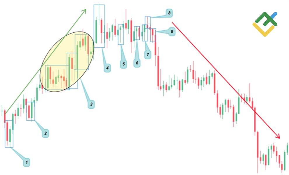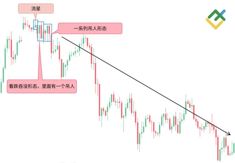 第一个反转信号是流星烛台,表明趋势即将反转。接下来,出现一个看跌吞没形态,内部有一个吊人反转形态。