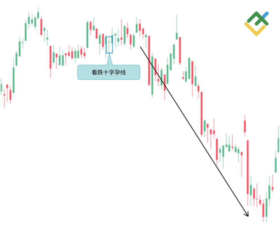 看跌十字孕线是一个强烈的反转形态,这意味着市场存在不确定性。该形态是一根大的向上烛台,后面跟着一个十字星。