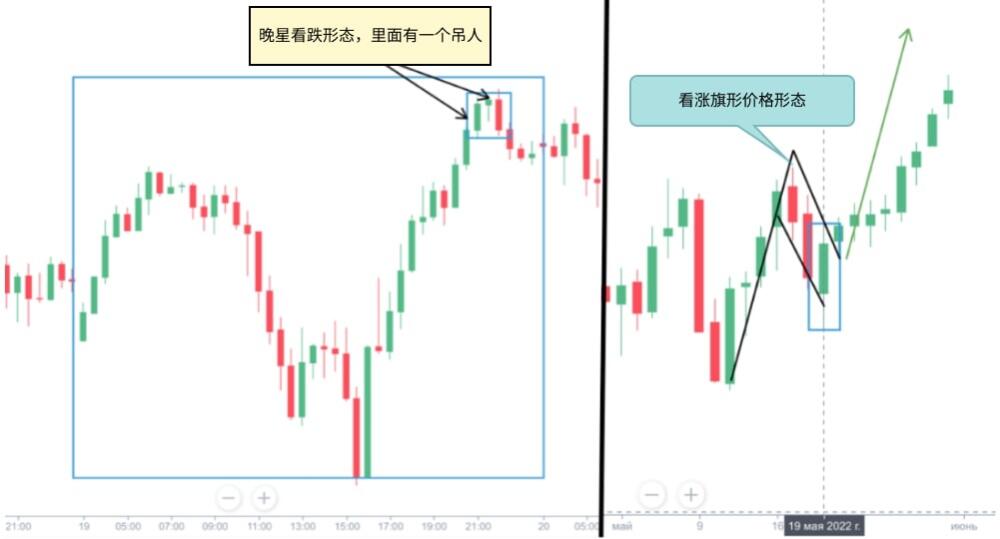 在较短的时间框架内,我们看到出现了晚星看跌反转形态,内部有一个吊人形态。
