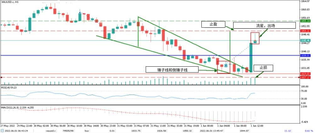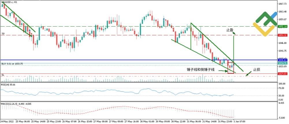 XAUUSD(黄金/美元)小时图表出现下降楔形。底部有两个看涨反转形态:倒锤子线和锤子线烛台形态。根据该信号,我进入买入交易,将止损位设在略低于锤子线形态下影线的水平,即 1826.58 水平。