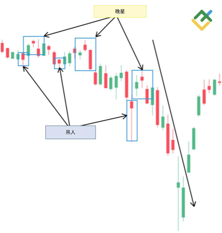 - 交易员可以在出现十字晚星、流星和一系列吊人形态附近的水平进入长期空头交易。这些形态均预示着抛售压力不断增加,表明即将出现下降趋势。