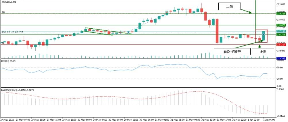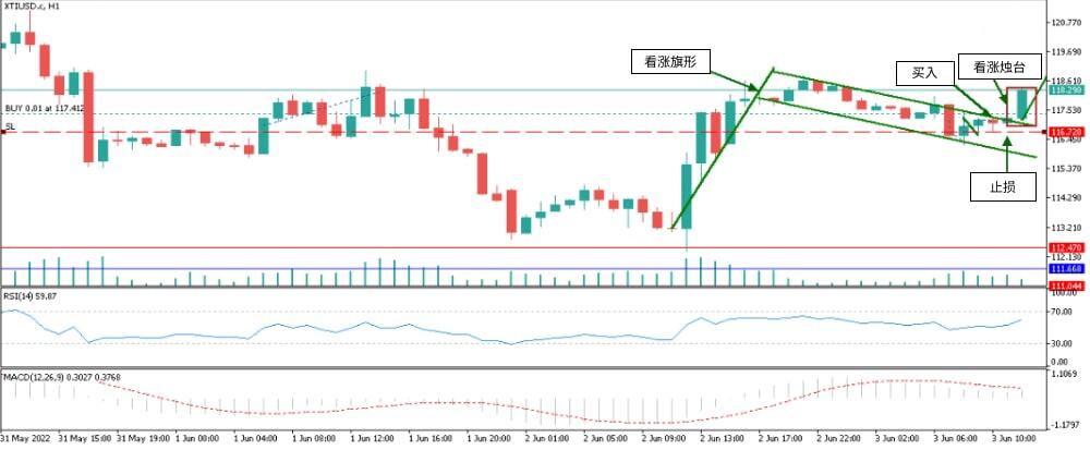 我们来看一下 USCRUDE 原油的每小时外汇图表。由于出现看涨捉腰带形态,趋势上升至局部支撑位 115.327 上方。该形态的另一个名称是看涨烛台。该形态表明价格将从该水平开始上涨,交易员最好进入买入交易。在本示例中,我在 116.969 水平进入买入交易,将止损位设在 115.320,将止盈位设在 119.704。