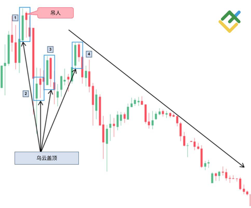 此外,还出现另外三个乌云盖顶形态,确认了下降趋势。