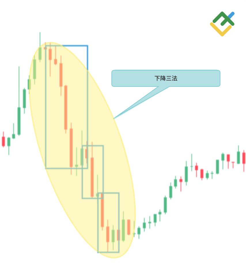 看跌下降三法或下降三部曲与看涨上升三法相反。