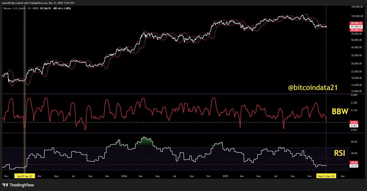 Analytics账户Quantdata21预计,由于周线RSI偏低且布林带波动指数创纪录收窄,比特币价格将出现波动。