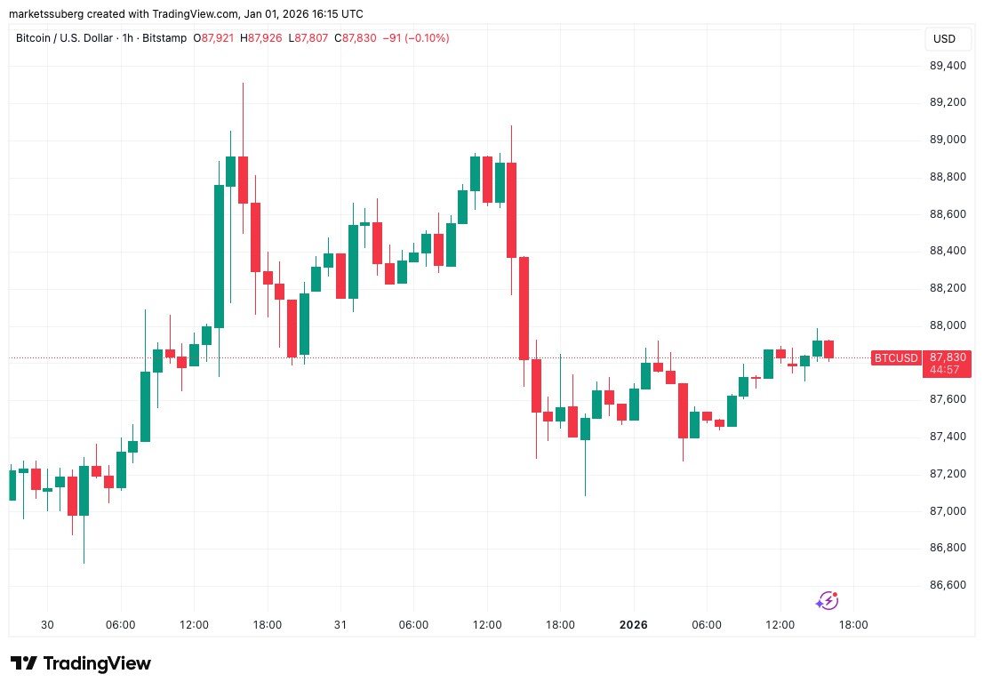 比特币在2026年以87,500美元开盘,市场正为今年首场华尔街交易时段做准备。