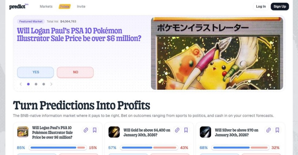 Predict.fun 是一个基于BNB 链的投注平台,您可以在上面预测市场结果。它的独特之处在于,当您的资金用于投注的同时,它会通过像Venus 这样的协议为您的资金赚取利息。
