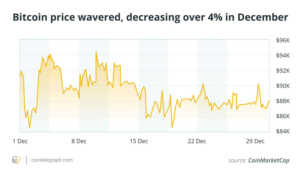 随着2025年接近尾声,比特币价格持续下跌,12月下跌了4%。