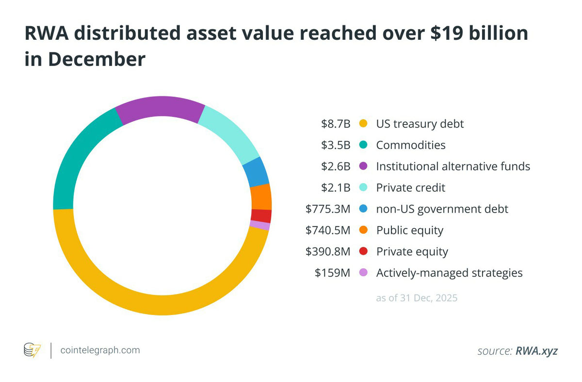 12月,现实世界资产(RWA)的总分布式资产价值增长了3%,突破190亿美元。其中,规模最大的是代币化美国国债,达87亿美元,其次是大宗商品,为35亿美元。
