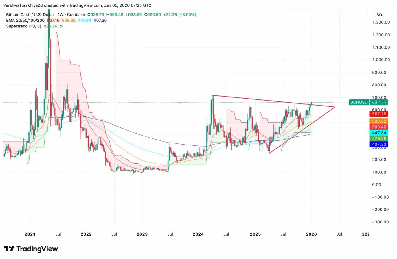 • 随着市场对 2026 年 5 月 CashVM 升级的预期升温,BCH 正在冲击 630 美元至 666 美元的多年阻力位。