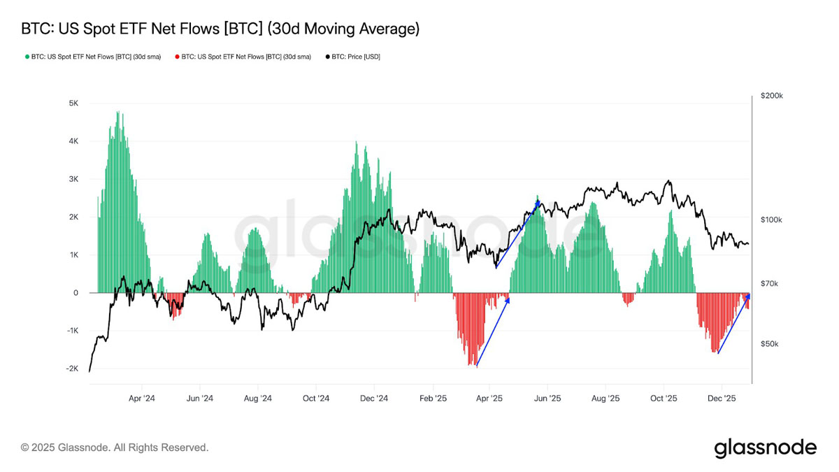 关于现货比特币ETF资金流, 詹姆斯·布尔表示,资金流出量已大幅减少,从11月21日的-1,600个比特币降至目前的“接近于零”。下图显示,4月份也曾出现类似情形,随后比特币价格在5月22日大涨33%,至112,000美元。布尔补充道: