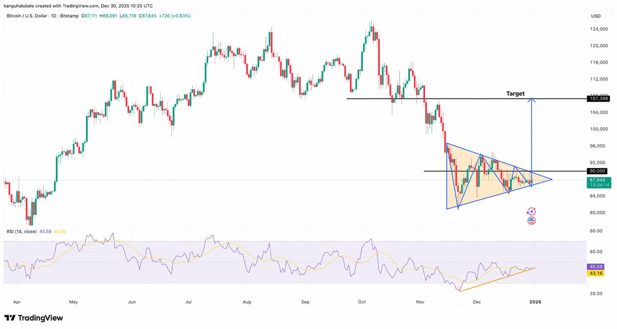 - BTC的对称三角形形态预示着价格将上涨22%,至107,000美元。