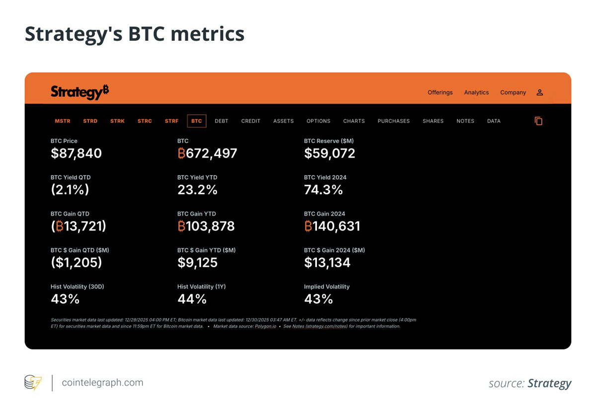 为使投资者能够清晰理解这一故事,Strategy 依赖一组原生比特币指标。其中最关键的一项是“BTC 收益率”,该公司将其定义为每股比特币的逐期变化,即其“BPS”比率,用以追踪每一份稀释后股票所对应的比特币数量是否随时间增加。