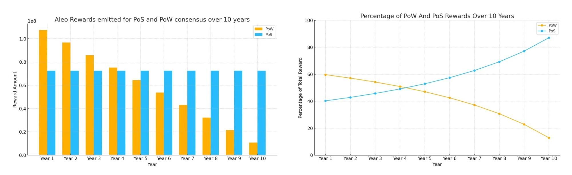 以下图表展示了未来十年中,Aleo积分通过PoS和PoW共识释放的数量变化及其比例关系: