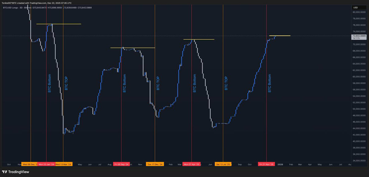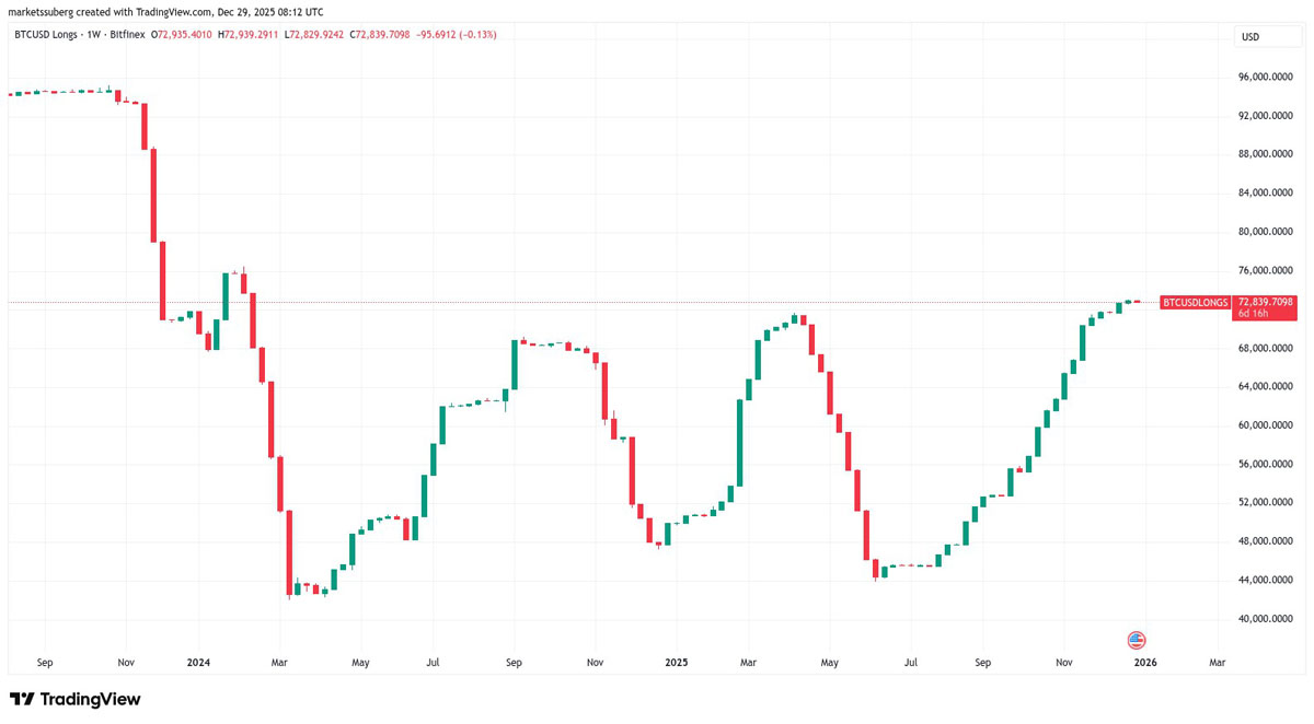 比特币未能于2025年最后一周伊始突破9万美元支撑位,但Bitfinex巨鲸的多头头寸却升至近两年来的最高水平。