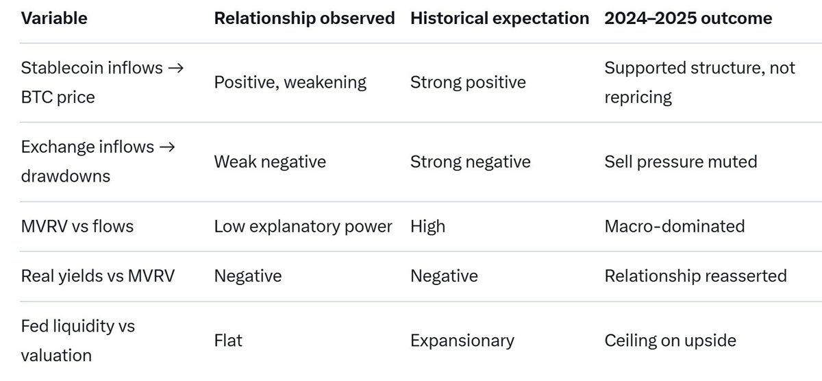 对2024-2025年期间的统计分析还显示,稳定币流入与交易所净流量合计仅解释了MVRV波动的不到6%,这表明估值动态已不再主要由链上比特币流动驱动。