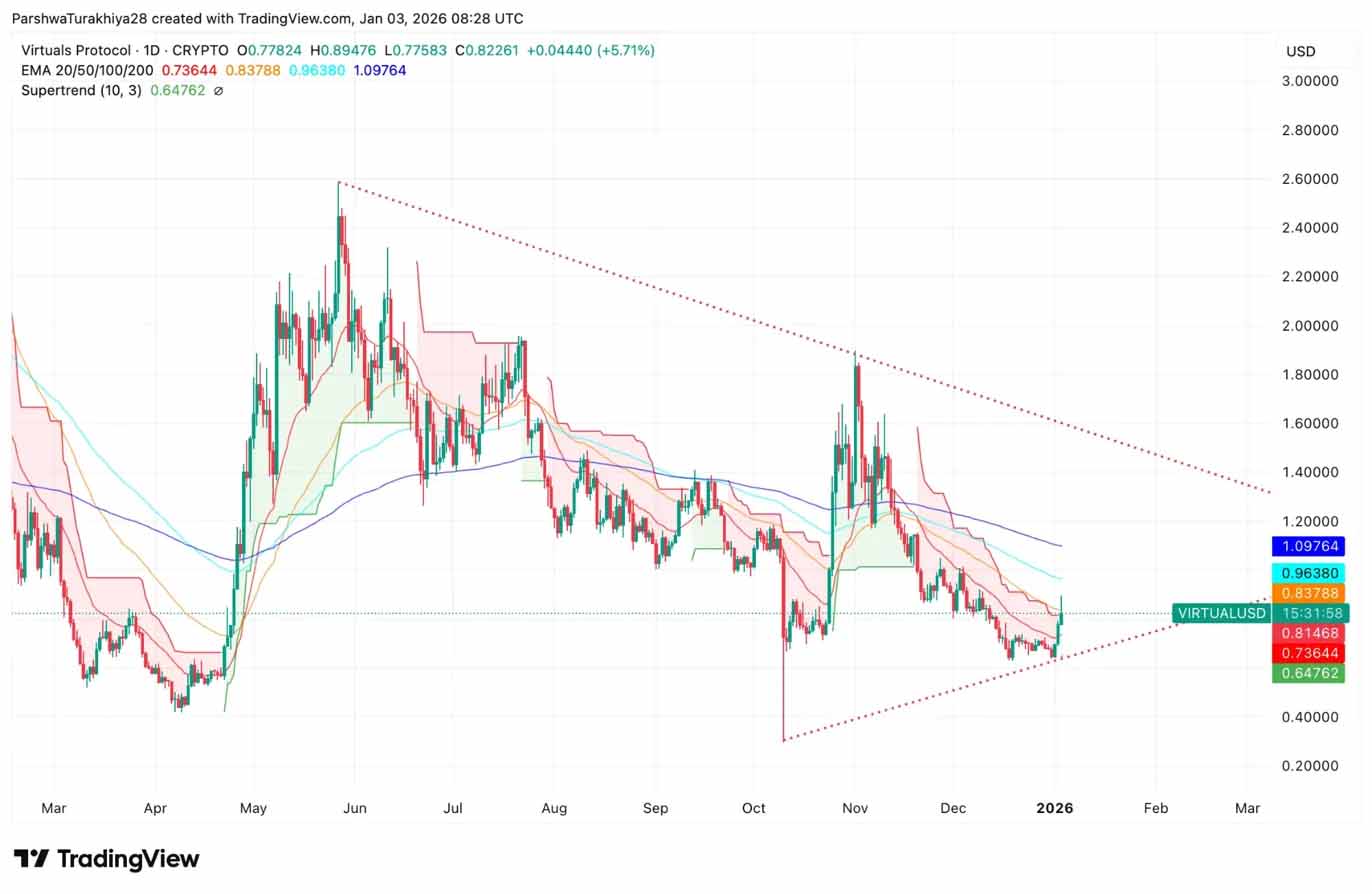 日线图显示,VIRTUAL 股价在 0.64 美元至 0.89 美元区间内盘整,此前股价已从 2025 年 5 月的峰值 2.70 美元回调 70%。股价低于 0.73 美元、0.83 美元、0.96 美元和 1.09 美元等主要指数移动平均线 (EMA),形成看跌格局。0.64 美元附近的超级趋势线提供支撑。